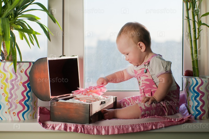 Девочка сидит на подоконнике и играет со шкатулкой