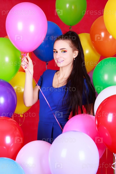 Портрет молодой привлекательной женщины среди воздушных шариков