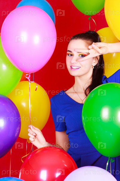 Портрет молодой привлекательной женщины среди воздушных шариков
