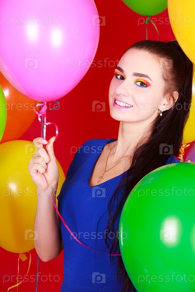 Портрет молодой привлекательной женщины среди воздушных шариков