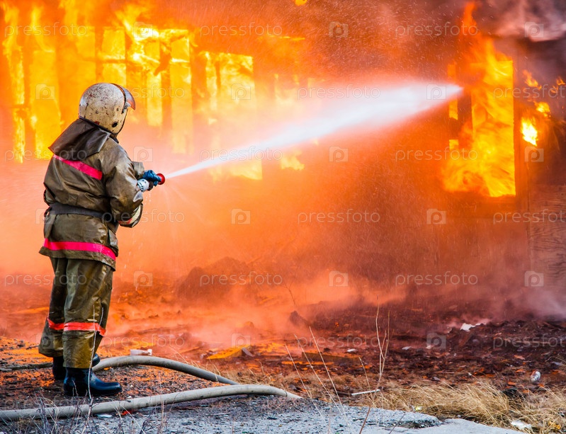 Пожарный тушит пожар