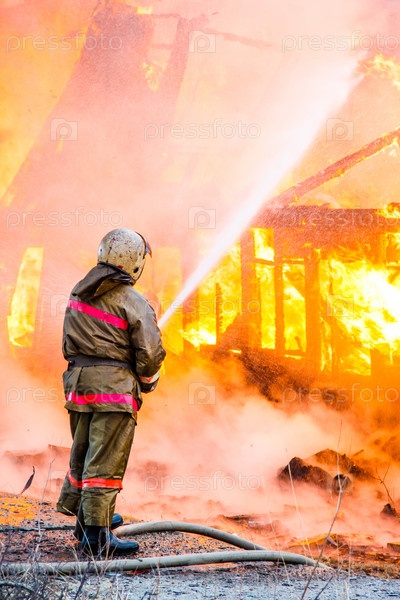 Пожарный тушит пожар