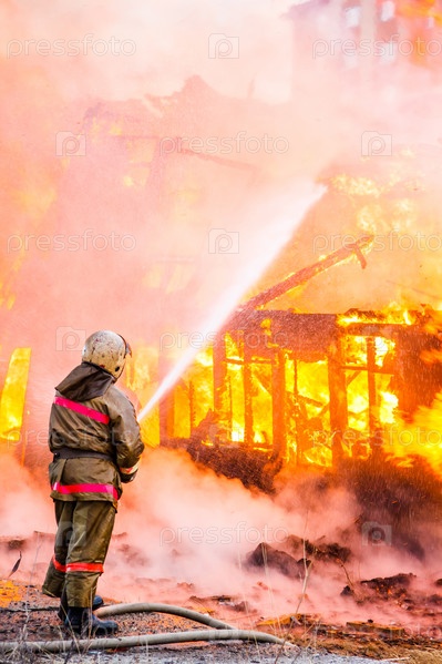 Пожарный тушит пожар