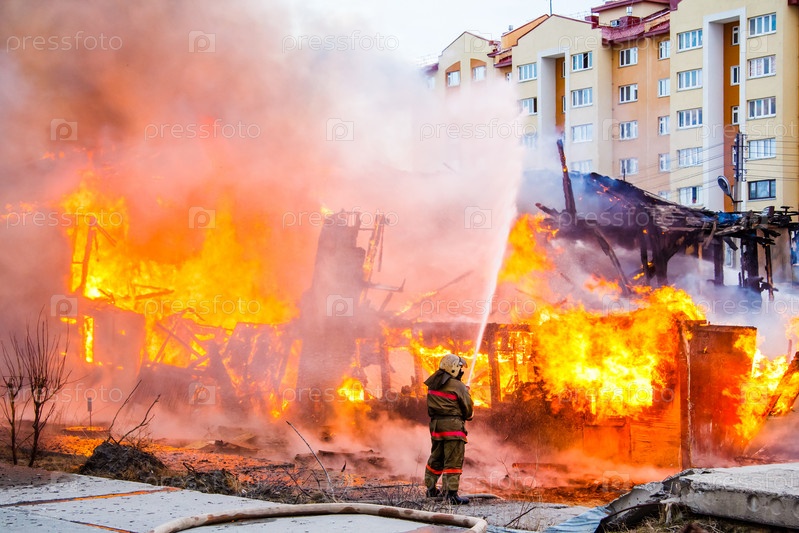 Пожарный тушит пожар