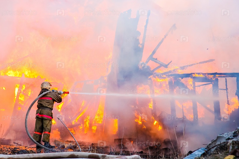 Пожарный тушит пожар