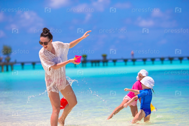 Молодая мама играет с дочками на пляже