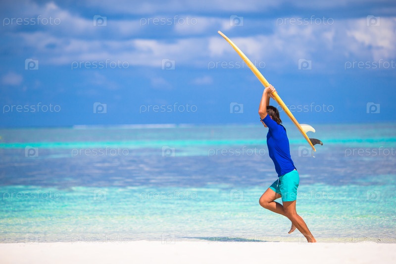 Счастливый молодой человек бежит с доской для серфинга в руках