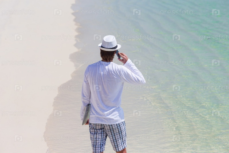 Молодой человек разговаривает по телефону на пляже