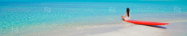 Девушка сидит на доске для серфинга на пляже