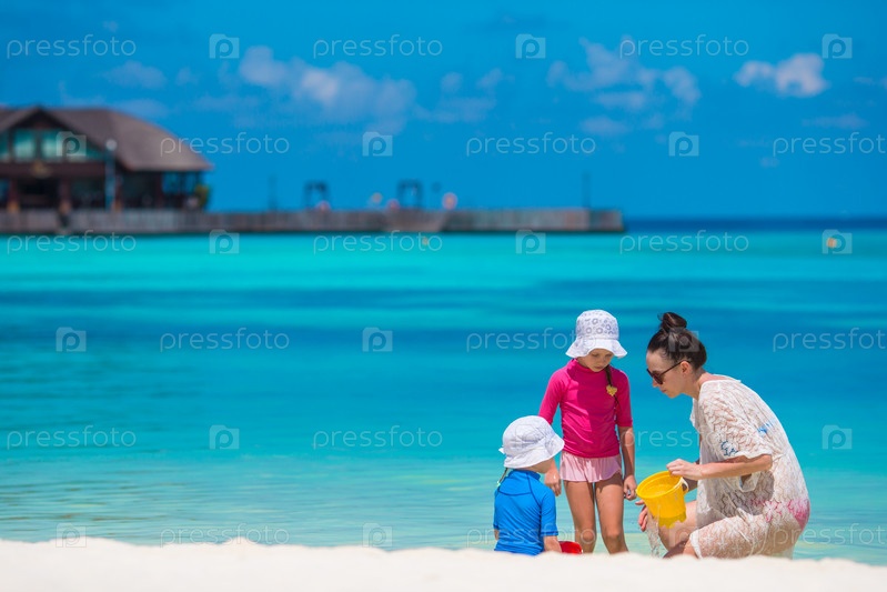 Мать играет с дочками на пляже