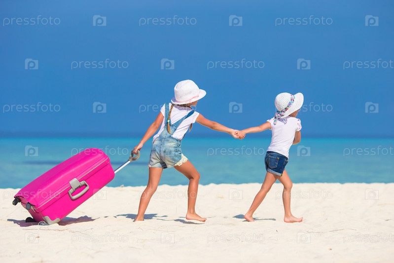 Маленькие девочки с багажом на пляже