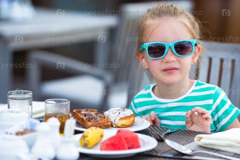 Маленькая девочка, за завтраком в открытом кафе