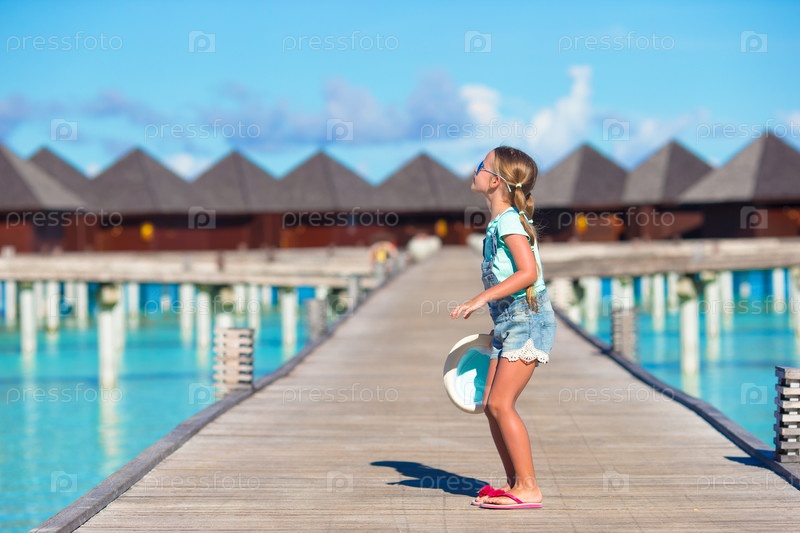 Очаровательная маленькая девочка возле бунгало на воде