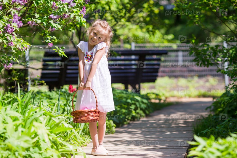Очаровательны девочка с цветами в саду