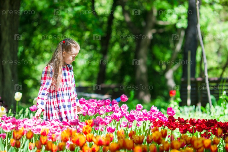 Красивая девочка в саду тюльпанов