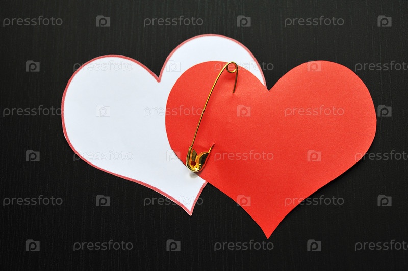 Два сердца, скрепленные булавкой, на темном фоне