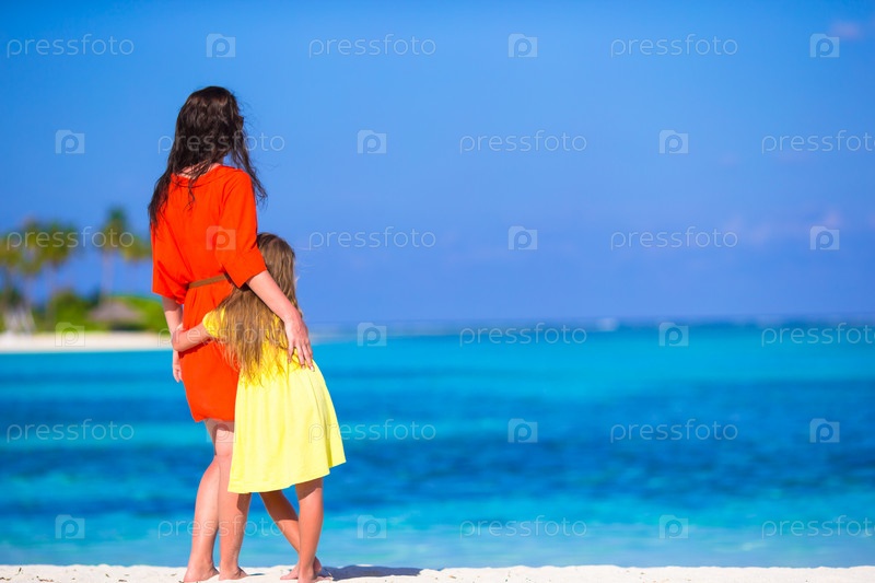Маленькая девочка и молодая мама во время пляжного отдыха