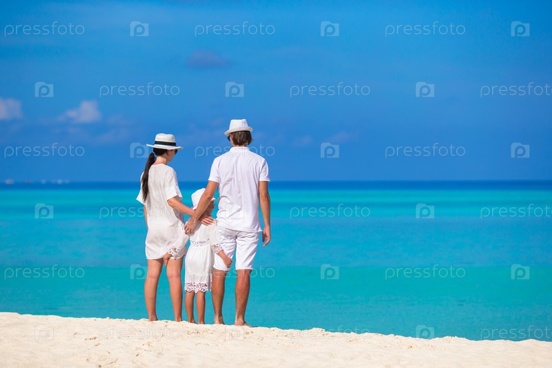 Молодая семья на белом пляже, во время летних каникул