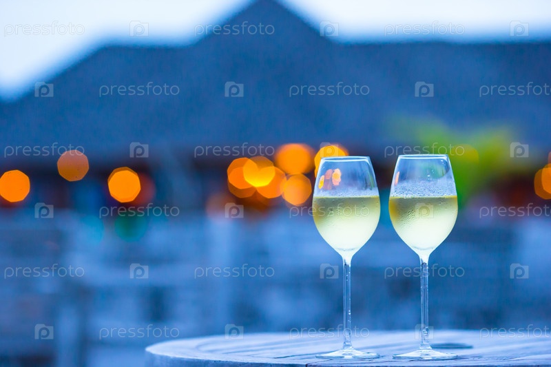 Два бокала вкусного белого вина на закате