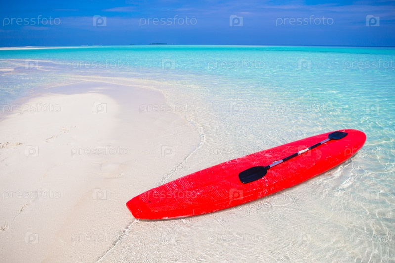 Красная доска для серфинга на белом песчаном пляже с бирюзовой водой