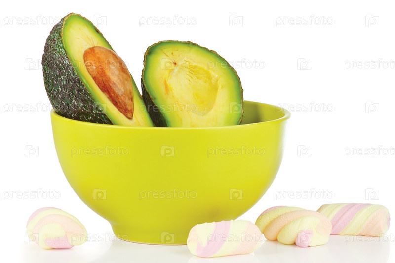 Нарезанный свежий авокадо в миске и конфеты на белом фоне