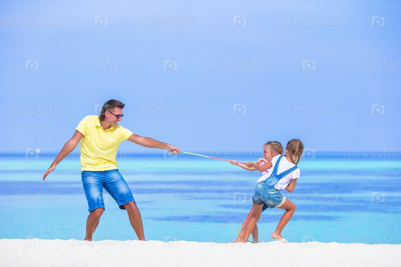 Молодой отец играет с дочерьми на пляже