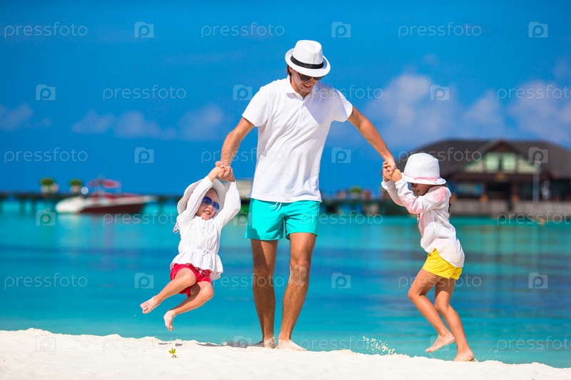 Счастливый отец играет с дочерьми на пляже