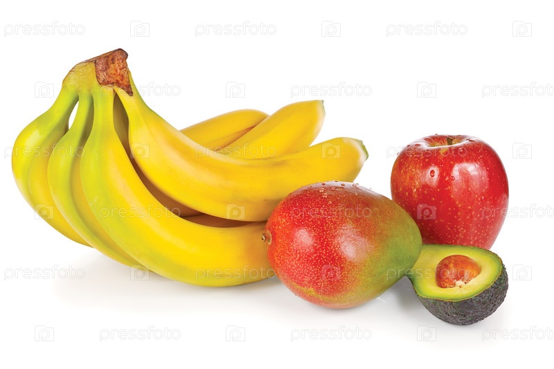 Связка бананов, манго, яблоко и авокадо на белом фоне