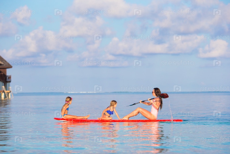 Мать с дочерьми на доске для серфинга