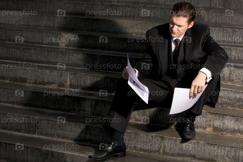 Портрет бизнесмена, сидящего на лестнице и смотрящего на документ