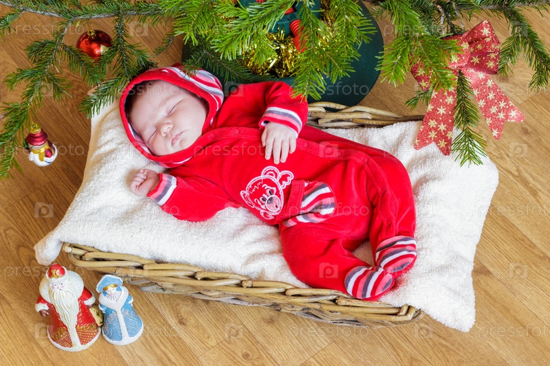 Новорожденный ребенок спит в корзине