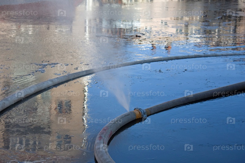 Брандспойт качает воду для пожарной службы, которая ликвидирует возгорание