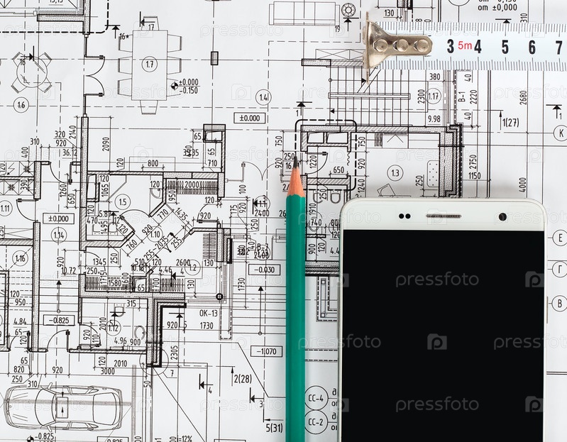 Чертеж, карандаш и смартфон