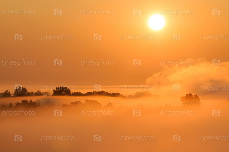 Густой туман в лучах восходящего солнца