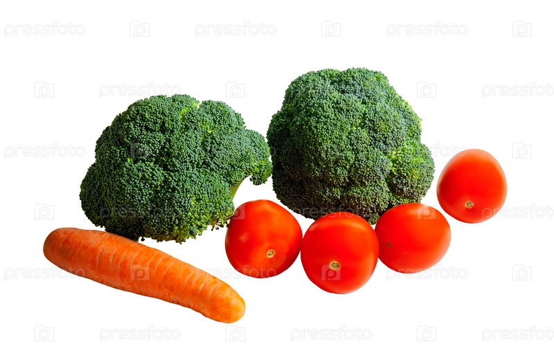 Брокколи, морковь и помидоры на белом фоне