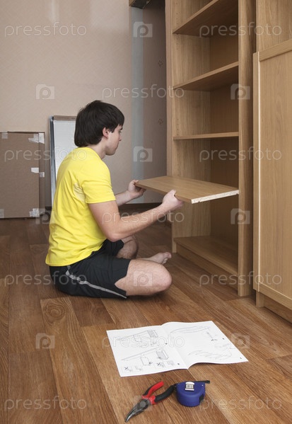 Молодой человек собирает шкаф