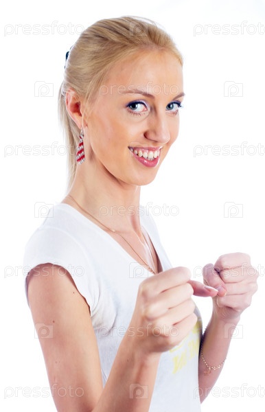 Молодая женщина с сжатыми в кулак руками на белом фоне