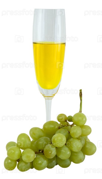 Натюрморт со стаканом вина и виноградами на белом фоне