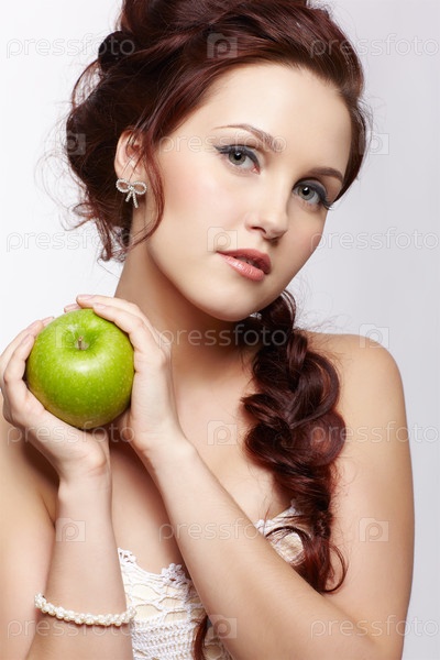 Портрет молодой женщины с высокой прической с яблоком в руке
