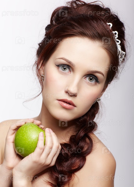 Портрет молодой женщины с высокой прической с яблоком в руке