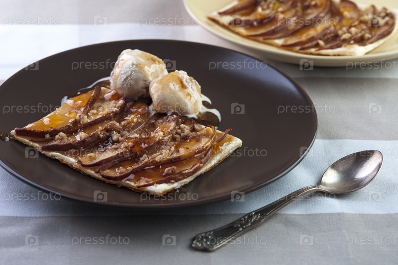 Груши, запеченные на слоеном тесте, с грецкими орехами и шариками мороженого