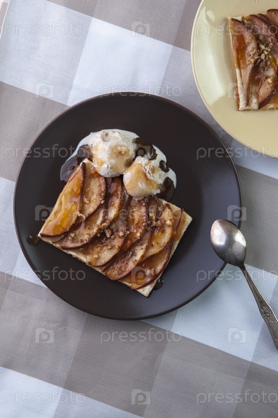 Груши, запеченные на слоеном тесте, с грецкими орехами и шариками мороженого