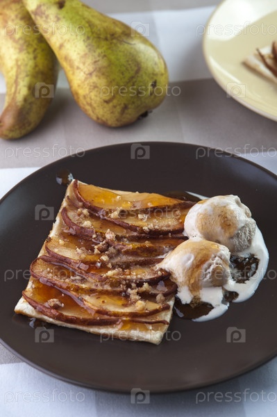Груши, запеченные на слоеном тесте, с грецкими орехами и шариками мороженого