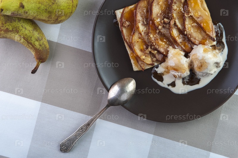 Груши, запеченные на слоеном тесте, с грецкими орехами и шариками мороженого