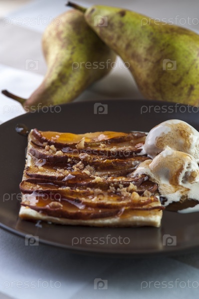 Груши, запеченные на слоеном тесте, с грецкими орехами и шариками мороженого