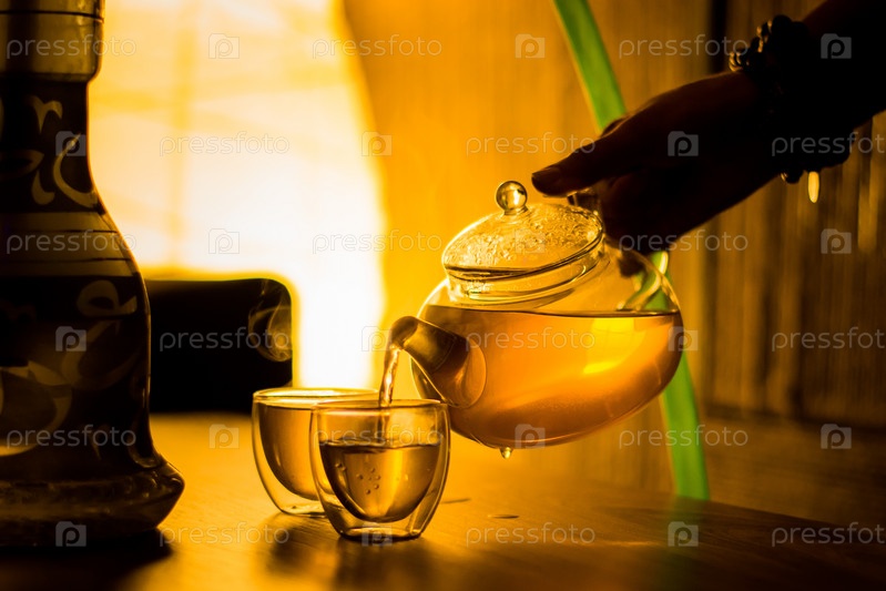 Официант наливает чай из чайника