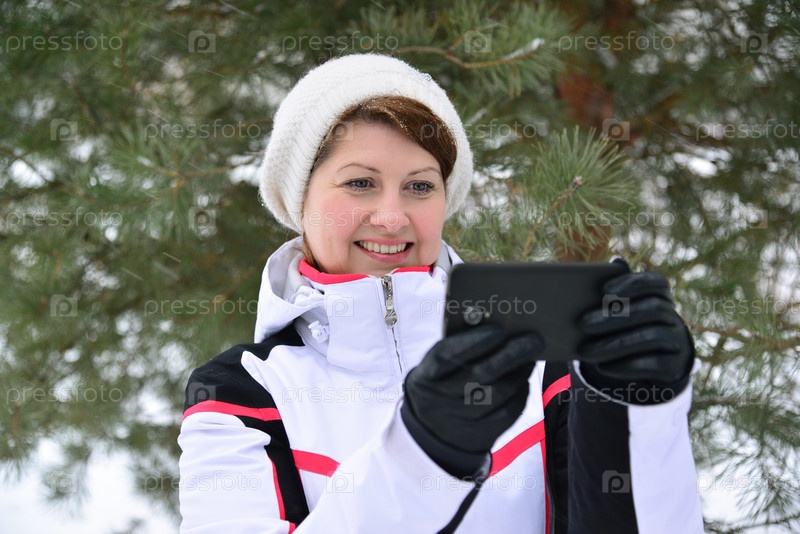 Женщина со смартфоном в зимнем парке