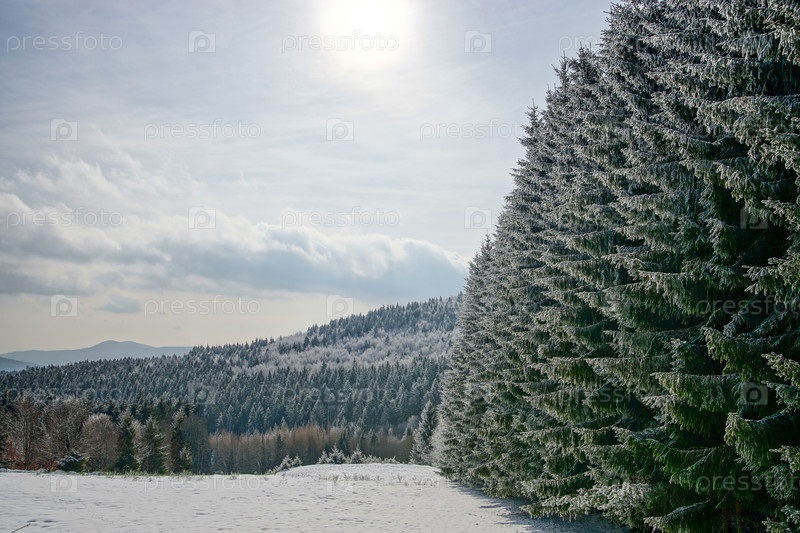 Красивые заснеженные ели в зимнем лесу