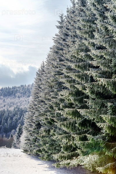 Красивые заснеженные ели в зимнем лесу