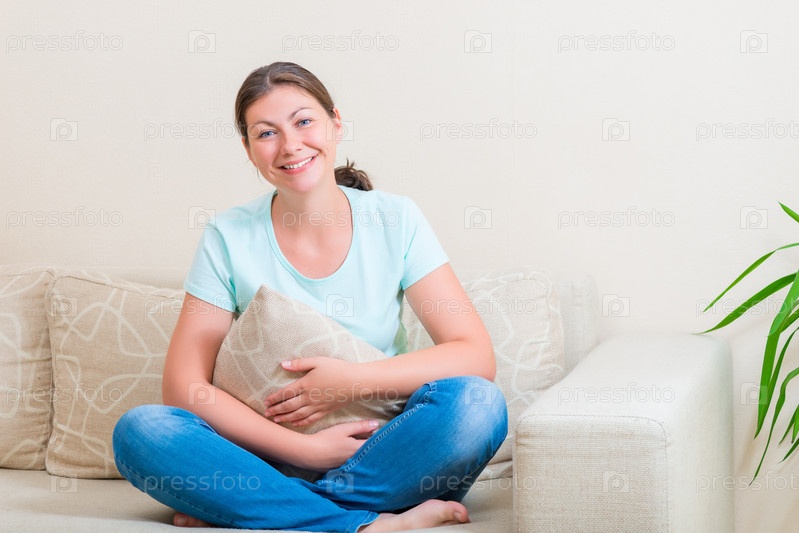 Красивая брюнетка с подушкой на диване